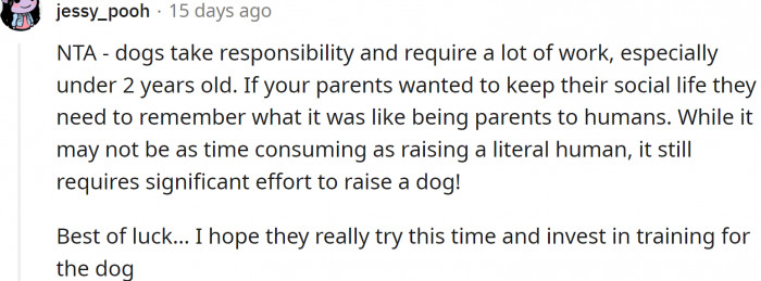 When they asked him to check on the dog and take her for a walk, let her out to relieve herself, and feed her once a week, OP was okay with it. However, at Christmas, his parents began having second thoughts about dog ownership and expressed that to their family.