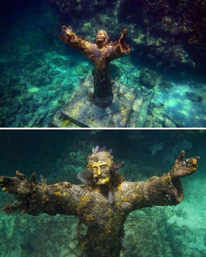 "The 'Christ Of The Abyss' Statue Is A 9-Foot-Tall Bronze Statue Of Jesus Underwater In Key Largo, Florida"