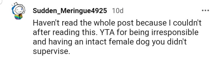 "YTA for being irresponsible and having an intact female dog you didn't supervise."
