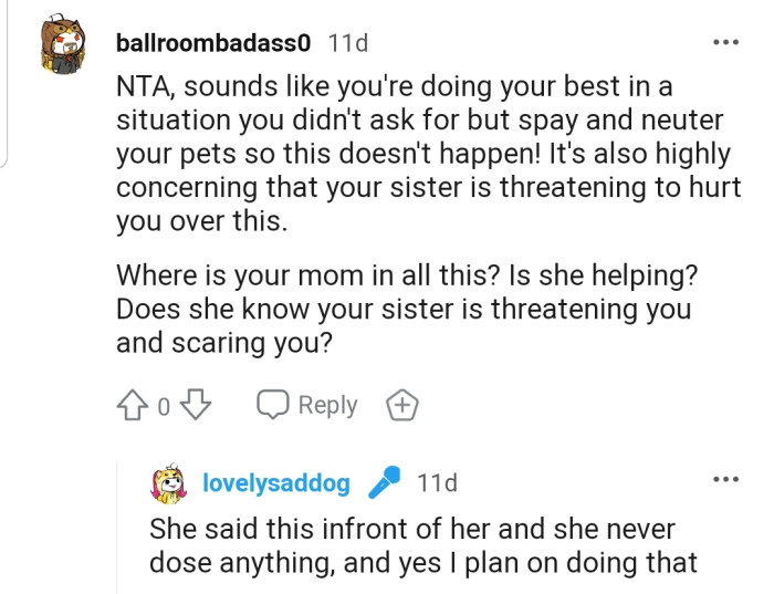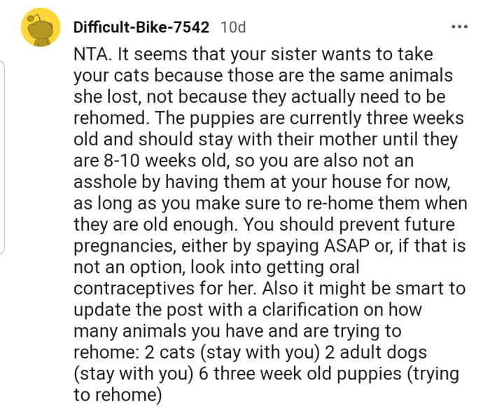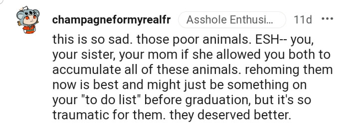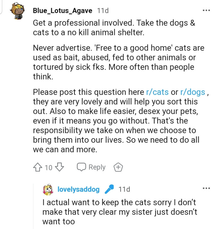 According to the Reddit community, OP shouldn’t have so many pets, and rehoming them may be the best option. However, they don’t agree with OP’s sister’s methods.