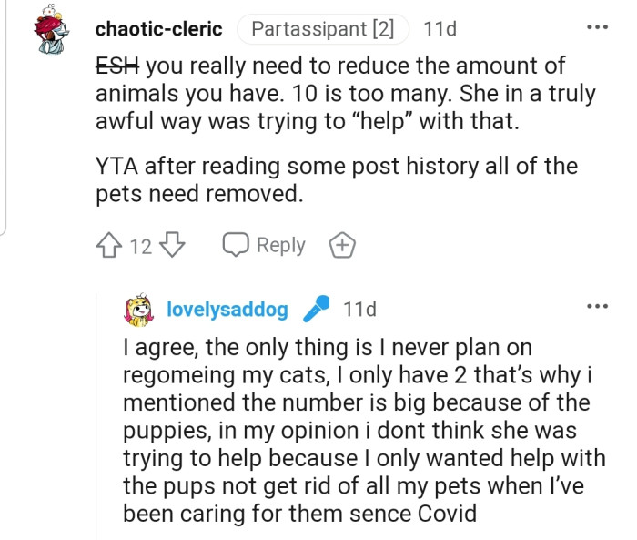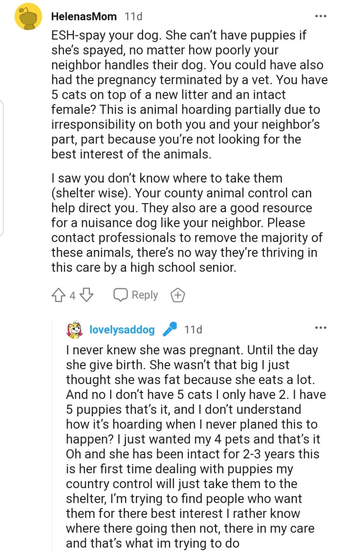 We found one pet owner on the AITA subreddit who was willing to find new homes for their puppies but not for their cats.