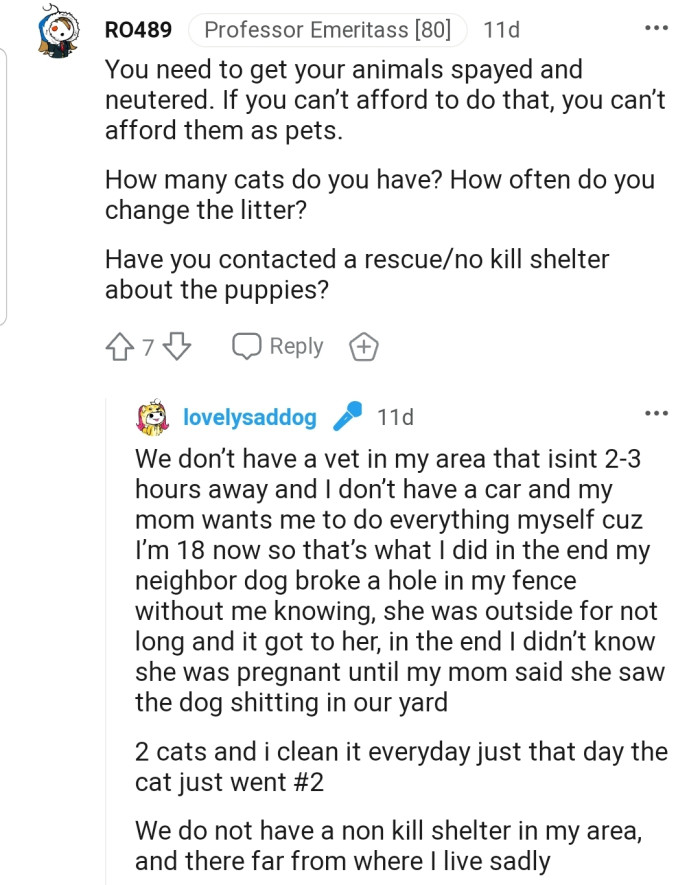 "You need to get your animals spayed and neutered. If you can’t afford to do that, you can’t afford them as pets."