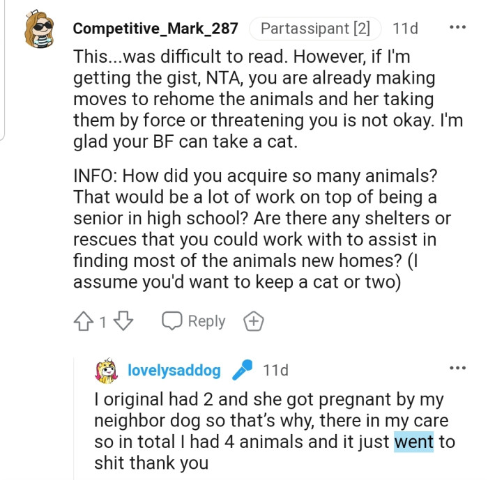 They further shared that they were in their last year of high school and figuring out a plan to accommodate their mother and boyfriend, so they asked their sister if she wanted a dog. In response, OP’s sister suggested they rehome all the pets, especially the cats.