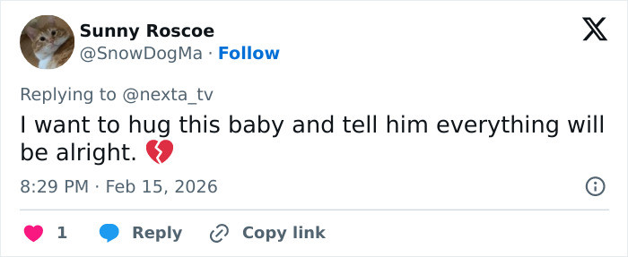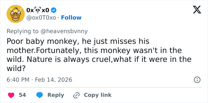 "Poor baby, I will cuddle you!" one person wrote. "Baby monkey just misses his mother. Nature is always cruel," shared another. "Poor little soul… glad he found something to comfort him," a third commented.