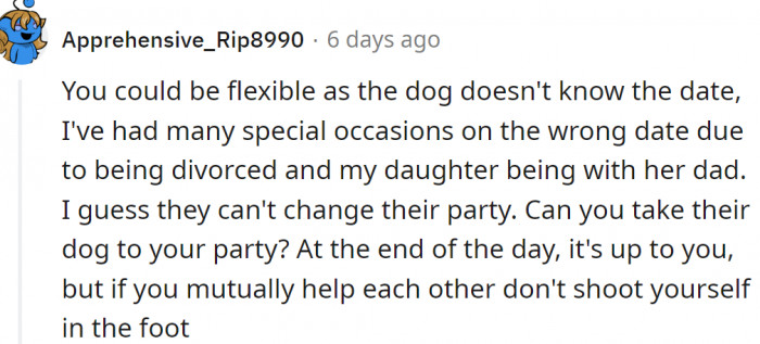 A lot of other Redditors advised her to change the date of the party. They believe it's a small issue that doesn't warrant a quarrel between them.