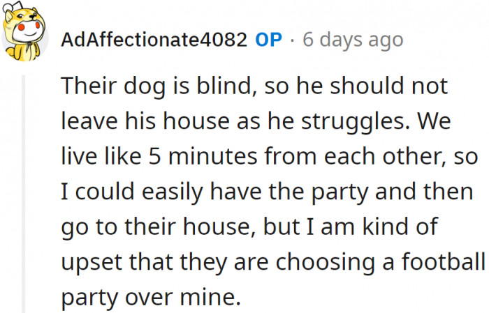 But even that wasn't the issue because they live very close. The problem was that she felt offended when her parents declined the invitation to her dog's party because they were planning to go to a football game.