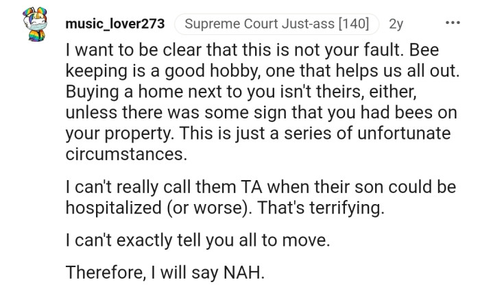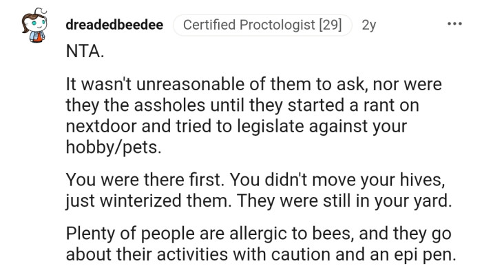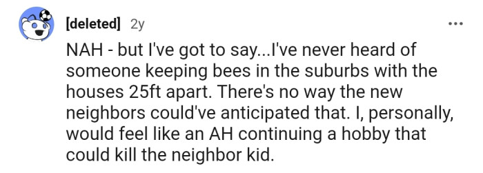 This Reddit community is torn in its decision. As much as their neighbor is justified in their request, you can't blame OP for standing their ground since they have kept the bees on their property for the past 6 years.