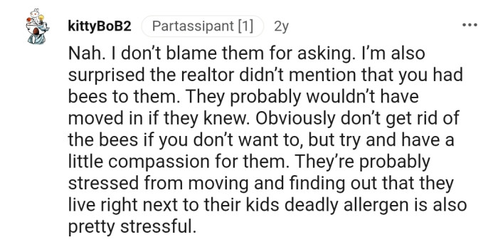 Many commenters have reiterated that the realtor is to blame for not informing the family about the presence of bees in the neighborhood. Regardless, people have pointed out that OP could have found a creative solution rather than give the family a flat "NO."