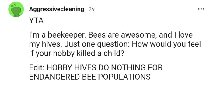 For some, like our narrator (OP), this passion spans years and involves multiple hives nestled in a serene suburban haven. Additionally, they have dutifully registered and complied with local regulations, thus validating the legality of their beekeeping pursuit.