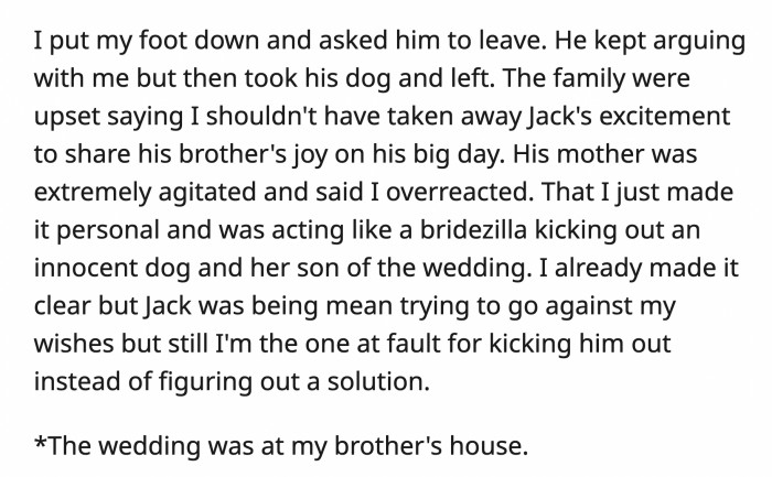 Her husband's side of the family was upset and told OP she was taking this opportunity away from Jack to enjoy his brother's wedding. Her mother-in-law said OP was a bridezilla for kicking an innocent dog out of her wedding.