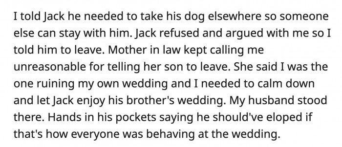 OP's newly minted husband just stood there and did nothing, saying they should have eloped if everyone was going to misbehave. Jack was still arguing with OP when she insisted he had to go, so Jack and his dog left.