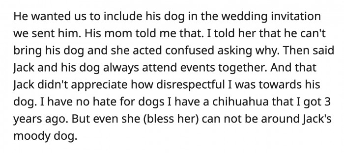 OP didn't even have to explain her reasoning for not wanting Jack's dog at her wedding.