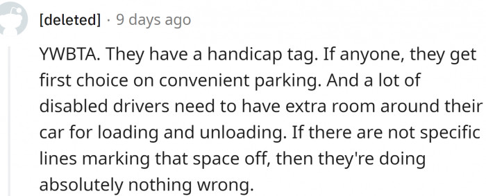 "They have a handicap tag. If anyone, they get first choice on convenient parking."