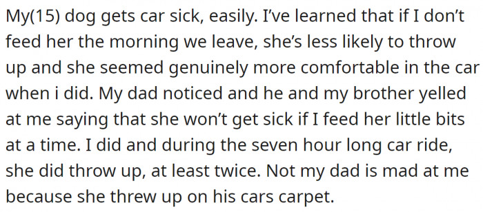 So he did, and, of course, the dog puked several times during the seven-hour journey. You probably think the Redditor has proven his point, but that's not his whole story.