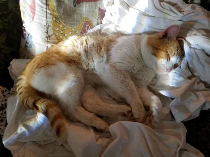 “We had a stray show up in the early nineties who was an orange and white female we named Carmel, and she was the best cat. A couple of years after she died, we adopted an orange and white barn cat we called Spooky, who was simply a joy. He died in 2008, and Mom has been wanting another.”