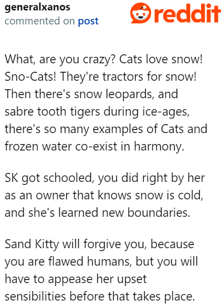 Redditors were entertained by the story, with some people sharing how their cats do the same kind of thing. Who would've thought that a dislike for snow could lead to such a comical scene?