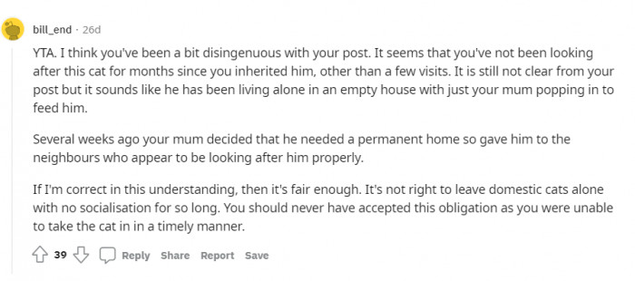 The first comment that actually agrees with the mother and isn't on OP's side. What do you think about this? She did leave the cat alone for some time.