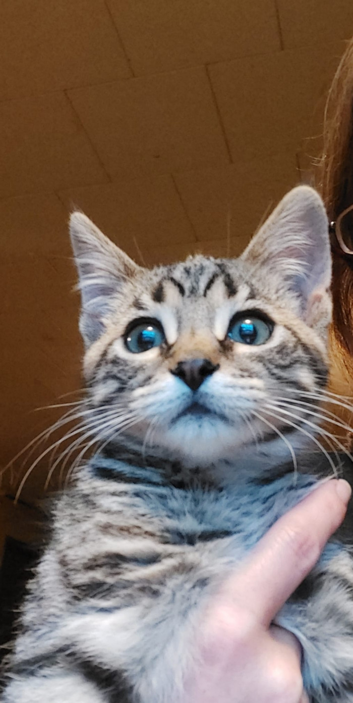 Finn also has the signature "M" on his forehead that most tabby cats do; in this case, it signifies where they rescued him from. Or perhaps, the "M" stands for a miracle.