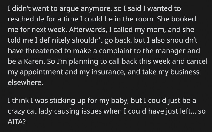After the waste of time, OP called her mom who told her she shouldn't go back for the appointment. She also told OP she was a "Karen" for threatening to file a complaint to the clinic's manager.