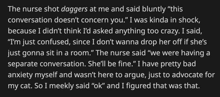 OP replied that she was concerned and didn't want to leave her cat if she was just going to wait in a room. The vet tech replied again that their conversation was different from what OP was asking and said her cat will be taken care of right away.