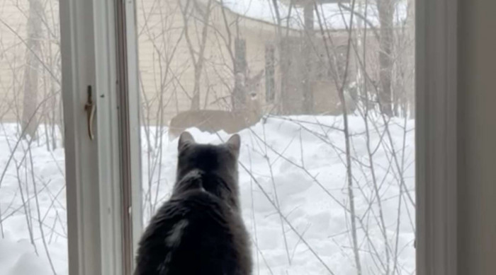 “I noticed Dolly outside and realized she was within view of our foster room, which is in our basement,” Burke says. “So, I ran downstairs to see if Lulu was looking out the window. We have a cat tree placed in front of the window, and Lulu was on the top perch watching Dolly. And Dolly was watching Lulu!”