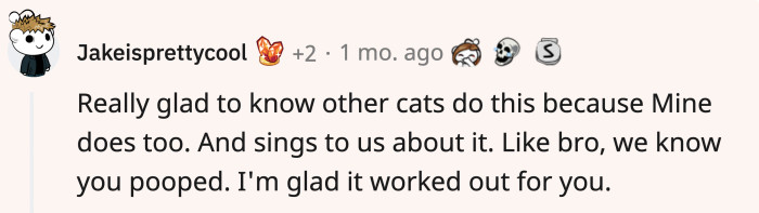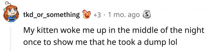 Like this Redditor's cat, who acts like she's being chased by a hellhound after she's done pooping