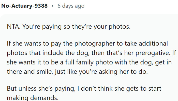 However, not everyone views pets in this way, and disagreements can arise when it comes to including them in important family events, such as family photos. OP is getting family photos taken this upcoming weekend.