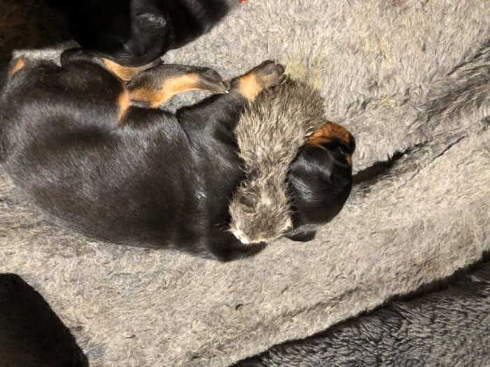 Callan's Doberman Pinscher, Ruby, has experience caring for other animals in the past. She has been known to carry baby bunnies in her mouth and lick guinea pigs as if they were her own.
