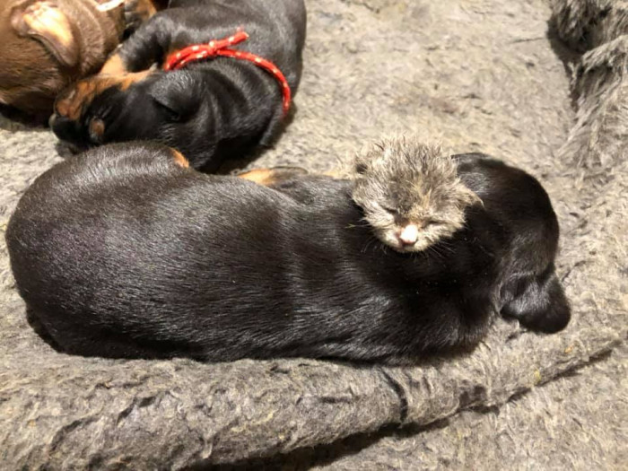 Even when Ruby is weaning her puppies, she can't seem to stand being separated from her baby kitten, even if it's just for a couple of minutes.