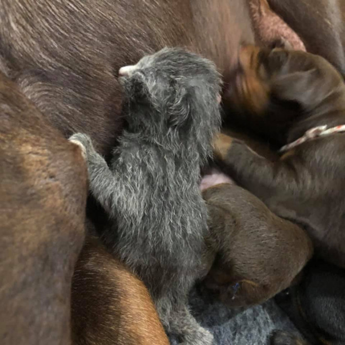 When the kitten was held out, Ruby started nudging and cleaning it on Callan's hand. The owner then tried opening the kitten's mouth and placed it on the dog's smallest nipple, and much to her delight, the kitten started sucking right away.