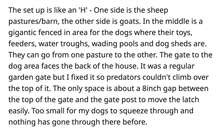OP's farm is shaped like a capital H — both sides are occupied by sheep pastures, goats, and a barn. In the middle lies a huge fenced-in area where the dogs can roam free surrounded by their toys, feeders, water troughs, a wading pool, and their shelter.