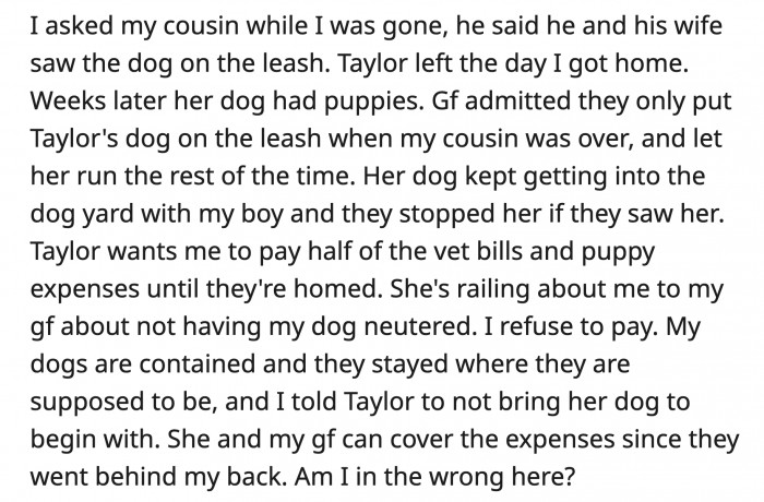 Taylor was complaining to OP's girlfriend about his dog not being neutered. OP said he won't pay because his dogs stayed in place so it isn't his fault.