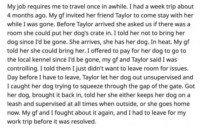 OP was not okay with this and offered to pay for the dog to go to a local kennel. Taylor and OP's girlfriend told OP that he was controlling but OP said he was just trying to prevent any problems from occurring.
