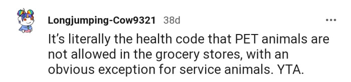 "It’s literally the health code that PET animals are not allowed in grocery stores."