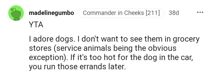 "YTA...I adore dogs. I don't want to see them in grocery stores."