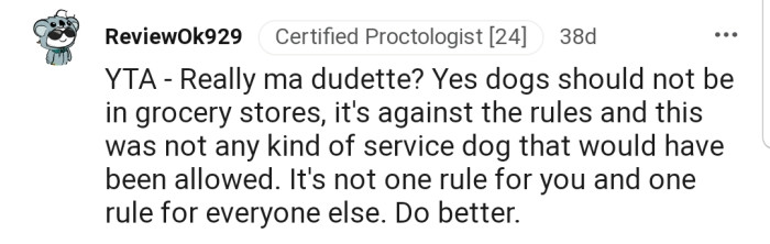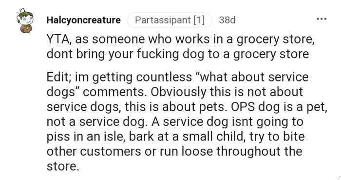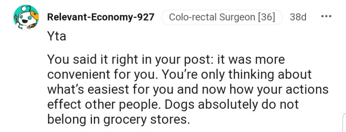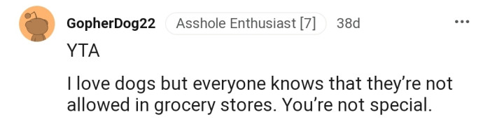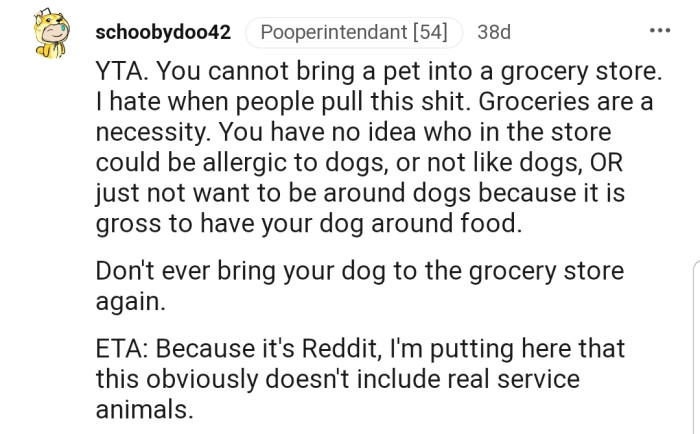 "YTA...As someone who works in a grocery store, don't bring your fucking dog to a grocery store."