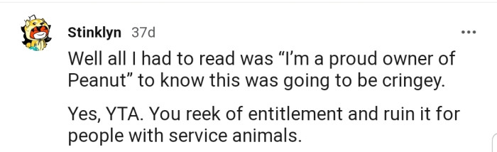"Yes, YTA. You reek of entitlement and ruin it for people with service animals."
