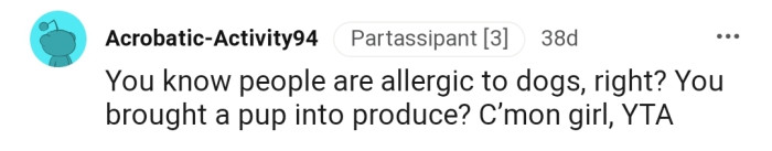 OP went with Peanut to the produce section to grab some items. There, she was approached by another shopper who scolded her for bringing a dog into the store.