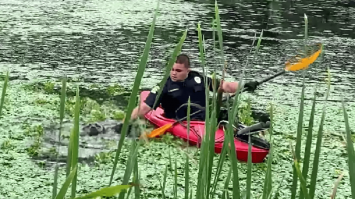 There was no time to waste for the officers, who had to act before Akela completely submerged. Officer John Kuligowski had the brilliant idea to borrow a kayak from a nearby resident.