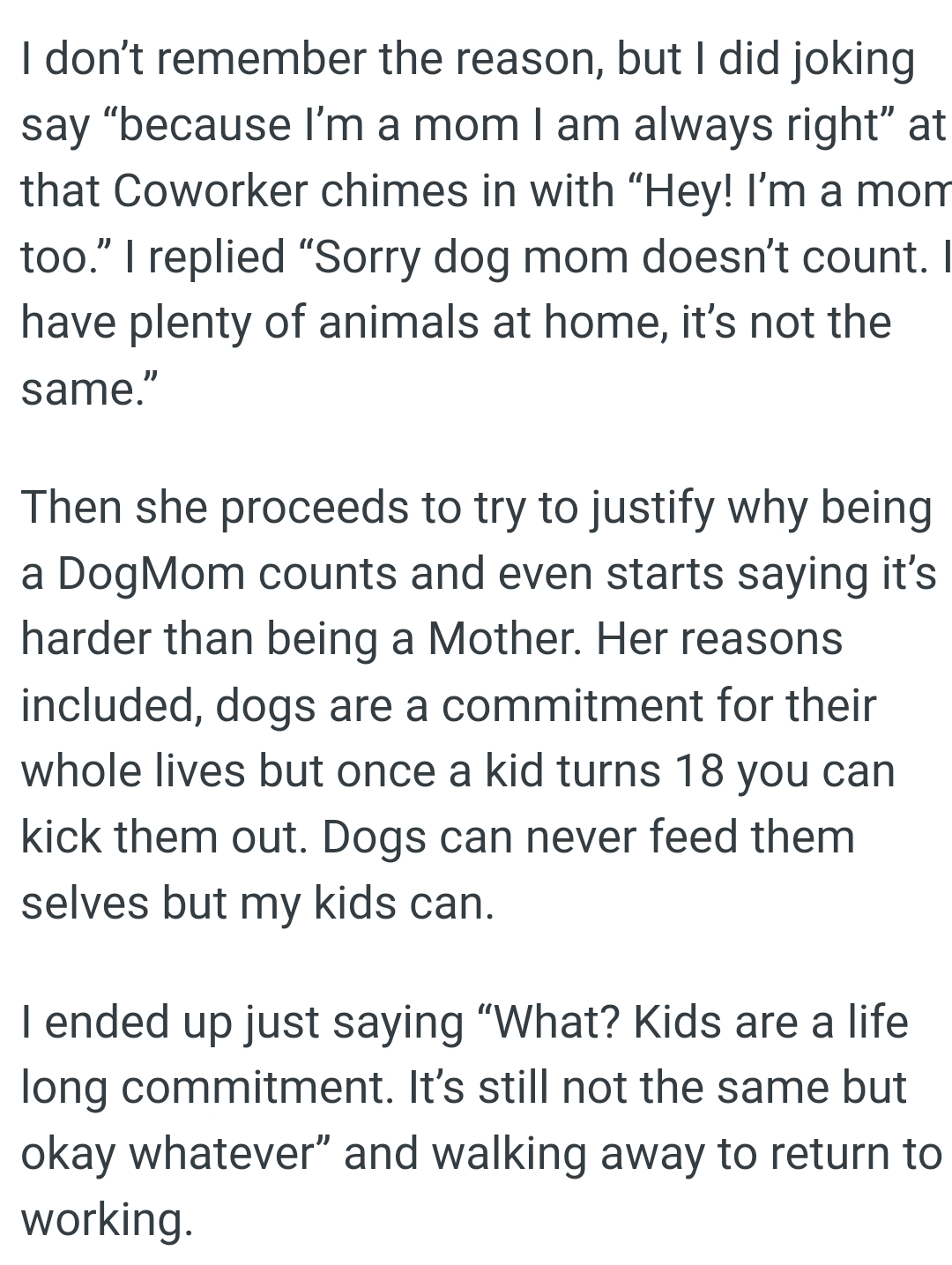 The OP says that she's always right because she's a mom, but her coworker claimed to be a mom too. The OP replied that being a dog mom doesn’t count, but that didn't sit well with her coworker.