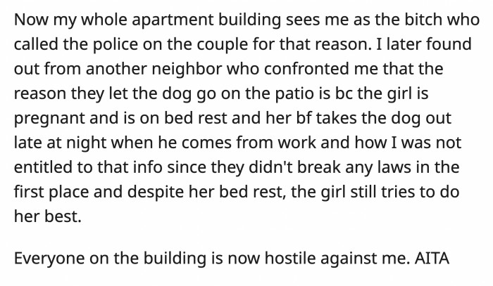 The incident spread around the building, and the other neighbors have made OP feel like she's a jerk for calling the police. OP found out through another neighbor why everyone was so offended on the couple's behalf.