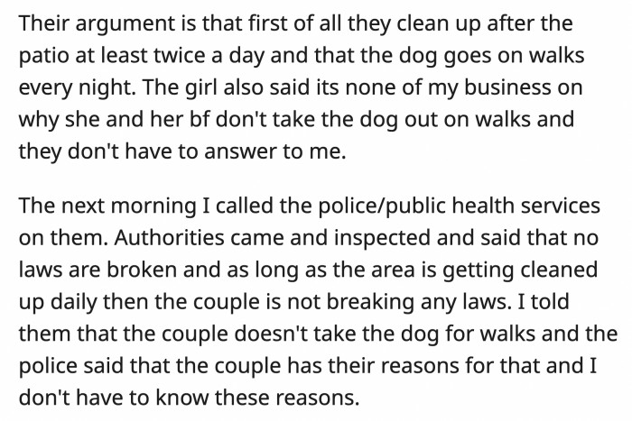 OP's neighbors said they clean their patio at least twice a day and that the dog goes on walks at night. The woman said it's none of OP's business why their routine changed and that OP has no authority over them anyway.
