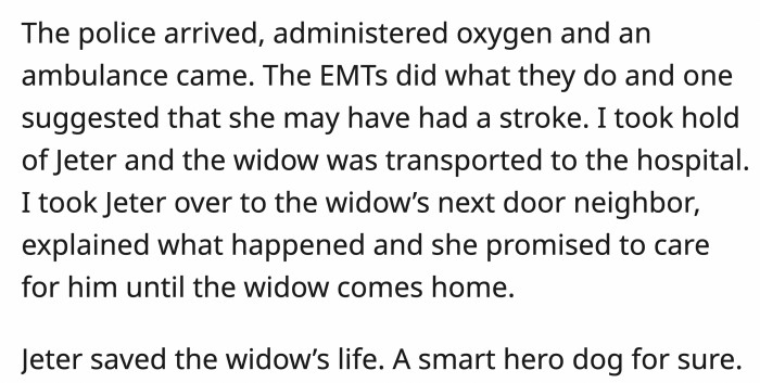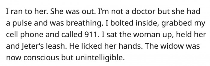 Unfortunately, OP deleted her account, and we have no update on how the elderly neighbor is doing. We are full of hope that she recovered and is home with Jeter right now.