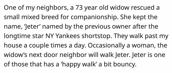 The duo walks past OP's house several times a day, and occasionally another neighbor walks Jeter for the old lady. OP knows it's Jeter because he is one of those dogs who has a bouncy, happy walk.