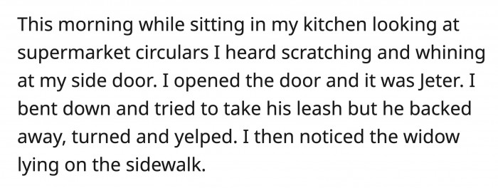 OP bent down to get his leash, but the dog backed away, turned around, and yelped. That's when OP noticed her elderly neighbor lying on the sidewalk.