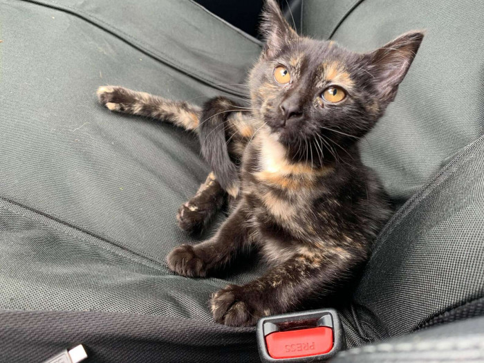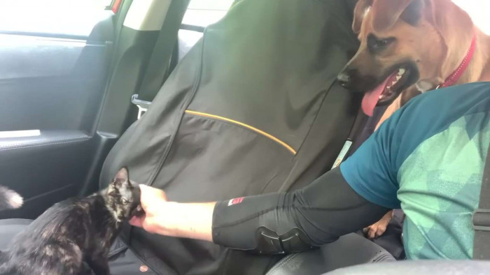 Garrison took the kitty to their car. Amaretto continued to watch over her throughout the entire ride. The kitty even got a name: Fuji.