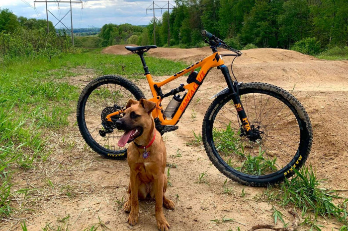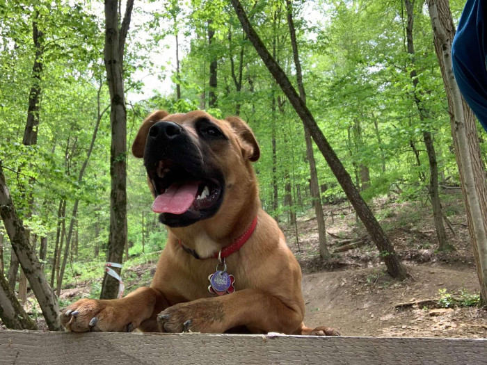 She and her human were out enjoying a forest trail in Ohio. Garrison was on his bike, and the dog ran alongside him.
