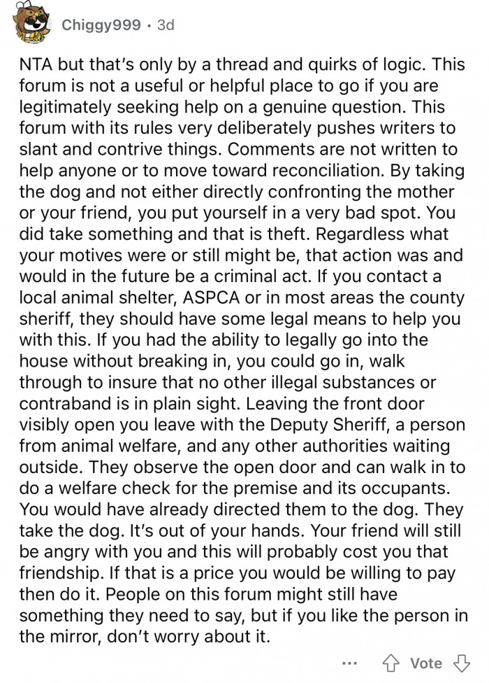 The Redditor's attempt to take her friend's dog highlights a powerful mix of empathy and moral distress, a common reaction when witnessing neglect or abuse. This behavior can stem from a strong emotional connection to animals, where individuals feel compelled to act, even if that means crossing legal boundaries. It’s crucial to recognize that while the motivation to protect is admirable, effective intervention often requires engaging the proper authorities to ensure both the animal's and the individual's well-being.