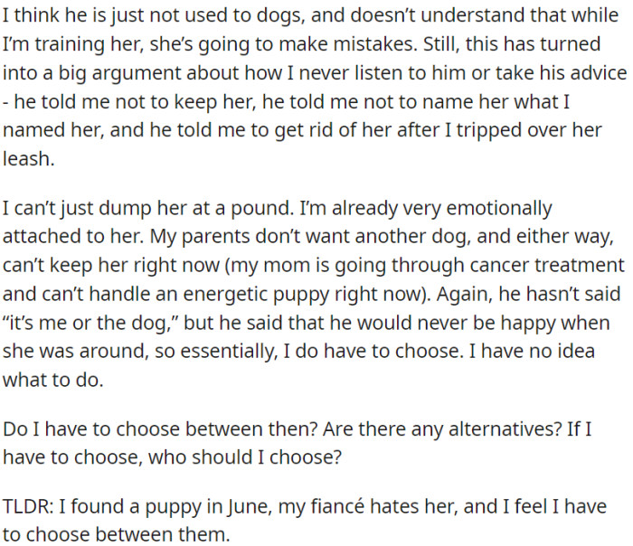 OP found herself in a heart-wrenching situation – the choice between the two she cared about deeply. While her fiancé hadn't issued an ultimatum outright, his feelings were unmistakably clear. She was torn between her love for a loyal and innocent pup and her commitment to her fiancé.