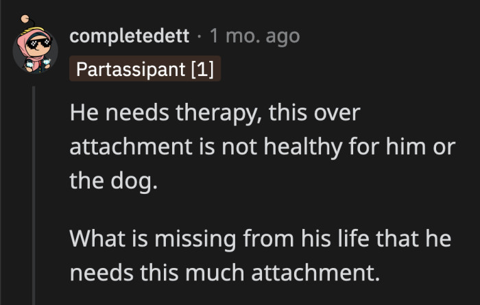 His unhealthy attachment to his dog is ruining every other relationship he has. We wish OP luck because she definitely needs it.